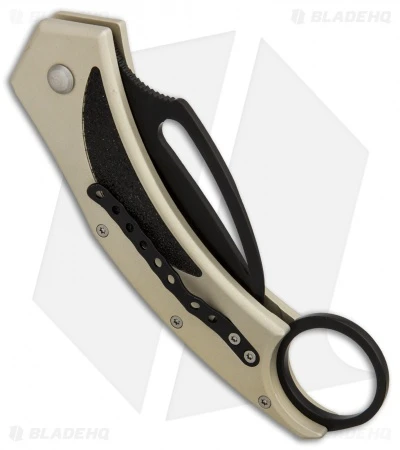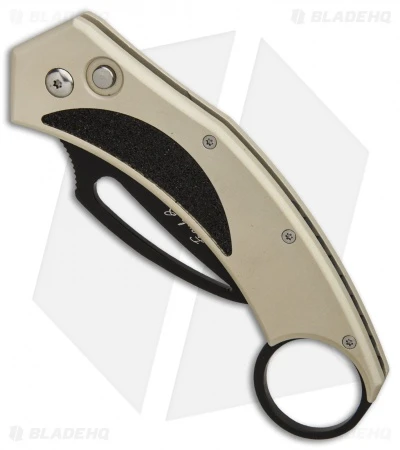 The Frank B Karambit offers an automatic opening blade and a lightweight handle for comfortable EDC. This model is outfitted with a tan anodized aluminum handle a black finished karambit blade.