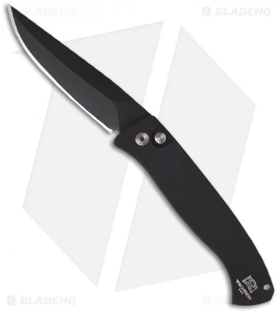 This Brend 2 automatic knife has a black finished 154-CM steel blade and black anodized T6 aluminum body with satin hardware and black pocket clip.