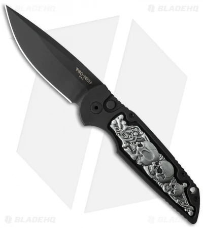 - Black anodized aluminum handle with a Shaw Skull Coin Struck inlay.