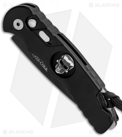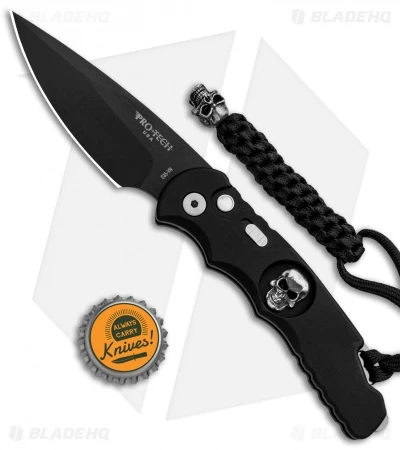 This TR-5 automatic model has a black anodized aluminum handle with a Bruce Shaw designed sterling skull inlay, mother of pearl push button, and a deep carry tip-up pocket clip. Its blade is made from CPM-S35VN stainless steel in a black DLC coated finish. A sliding safety lock allows secure pocket carry and prevents accidental blade deployment.
